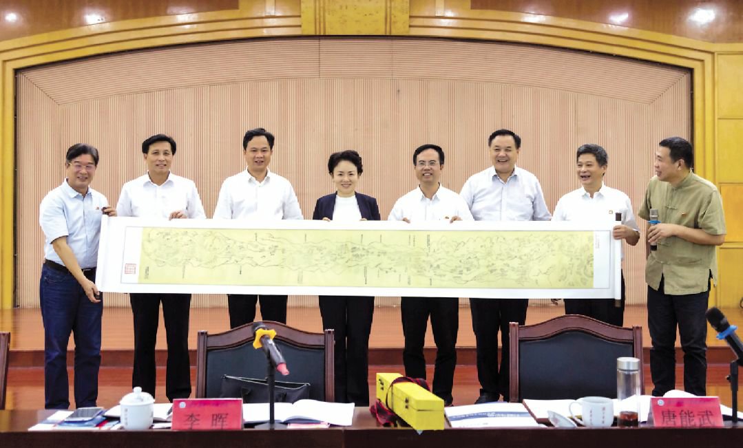 会上, 我校向市委、 市政府赠送了地方文化研究成果: 1828 年勘绘《永州府山川图》 《永州府道路图》 《永州四境陆路长图》 (长卷 局部) 、 10 卷 本《虞舜 大典》(一、二卷) 和全套新版《新元史》 点校本。