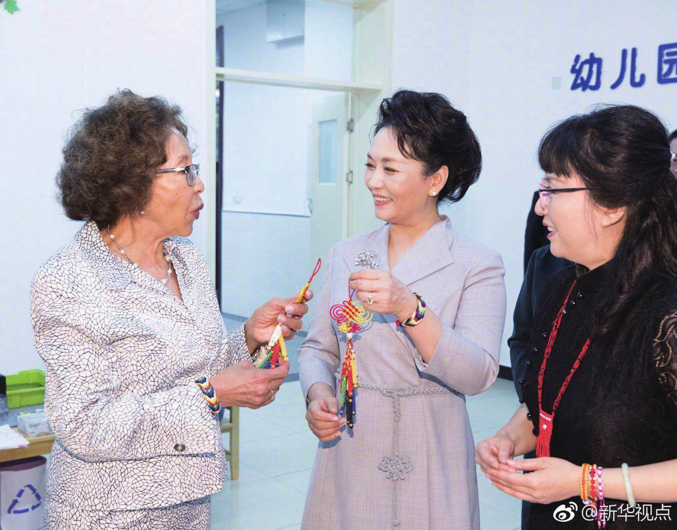 图片说明: 国家主席习近平夫人彭丽媛与南非总统夫人莫采佩观看学生们演示如何编织中国结。两人饶有兴致地参与其中。学生们为她们戴上精美的手链, 并向她们赠送了中国结饰品。 (新华社记者白洁 丁林 殷博古; 文图均来源于新华社新华视点)