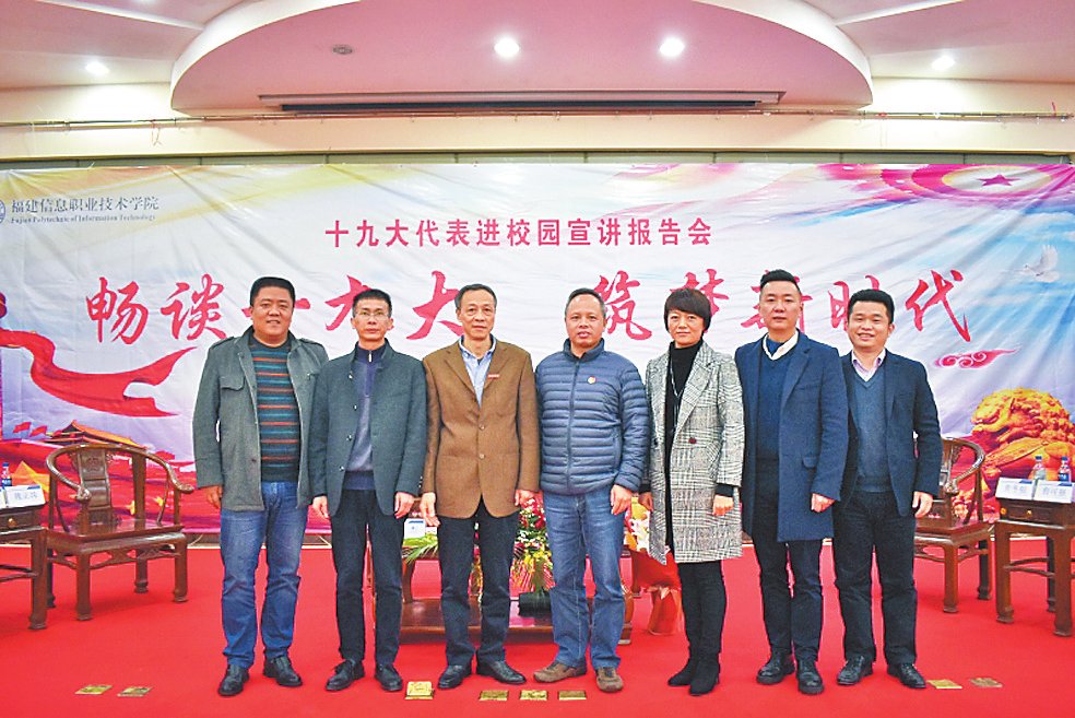 本报讯 2017年12月20日下午,党的十九大代表,平潭综合实验区城投集团党委副书记、常务副总经理,平潭综合实验区市政园林有限公司董事长、总经理叶志勇走进我校,与我校师生、校友代表一同畅谈十九大精神的学习体会。福建省委教育工委思想政治工作处调研员修德茂应邀出席,我校党委书记林杰主持报告会。校领导和校友代表、师生共200多人参加宣讲报告会。