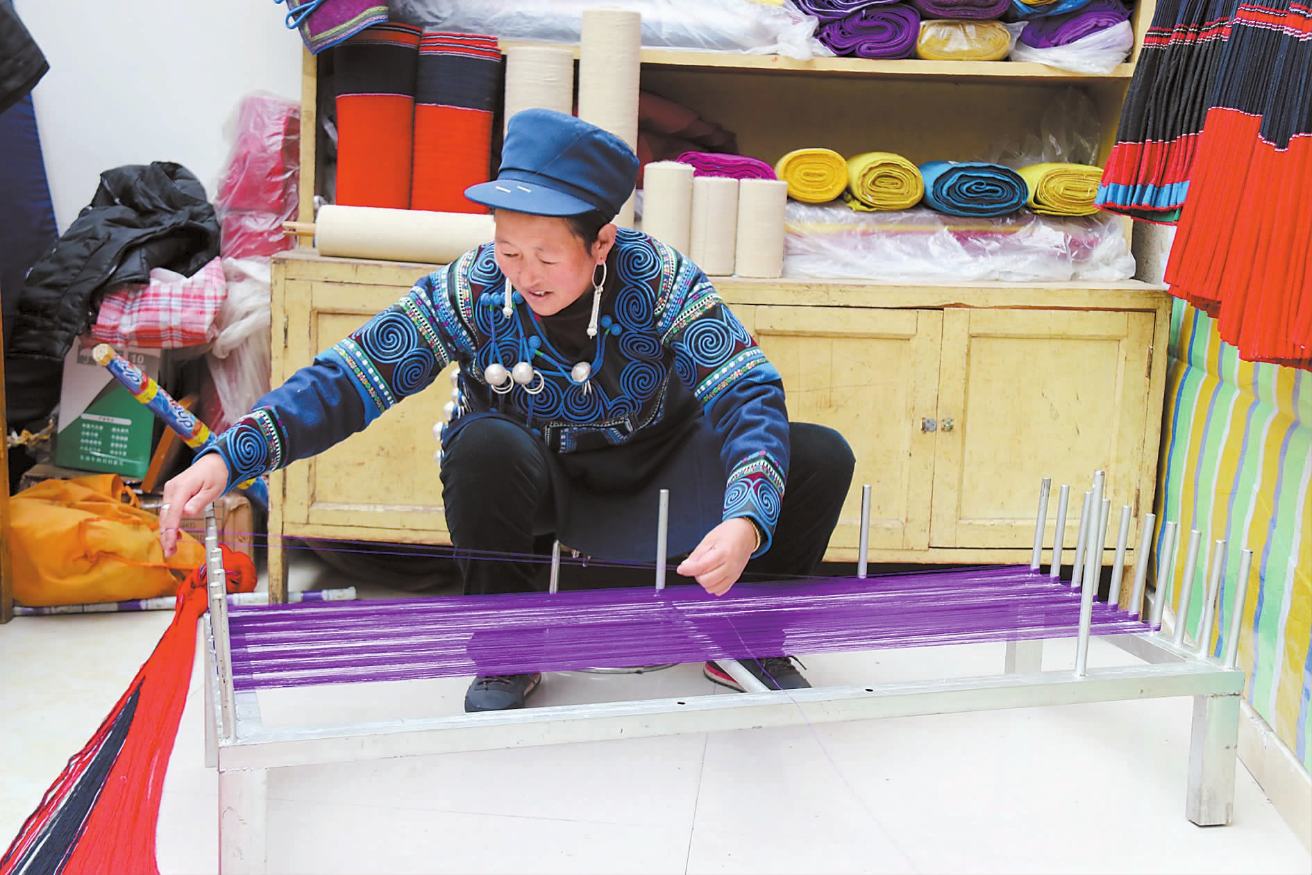 “铿铿,铿铿……”一种有规则的撞击声在耳边响起,寻声望去,在一处普通农房前的坝子里,一位头戴蓝色圆形帽子的彝族妇女席地而坐,双足蹬在一个织布工具的经轴上,双手灵巧地在纺织机上游走,用分经棍将经纱按奇偶数分成两层,用提综杆提起经纱形成梭口,以骨针引纬,打纬刀打纬,反复地重复着这样的动作。伴随着这个设备发出的“铿铿”声,那些横着的、竖着的彩色棉线被紧密地“织”在了一起。