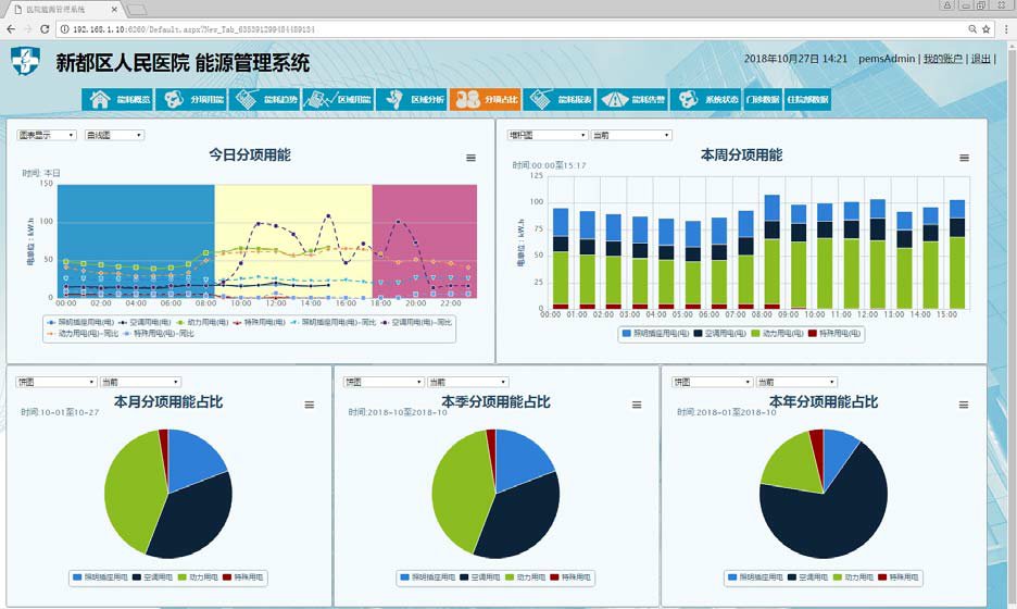 医院能源管理平台,具有180个计量点位,实现医院水、电、气主要用能设备能耗数据自动记录,设备能耗分析、分户能耗对比、用电参数实时监控、报表打印、管理诊断.异常问题报警、节能诊断、人工数据录入自动记录,对比分析。实现医院科室用能分项计量帮助管理人 员深入了解医院用能情况,为节能改造提供数据支撑。