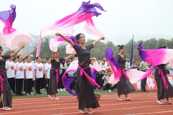 开幕式上,伴随着慷慨激昂的进行曲,国旗队、院旗卫队、会标标语方阵队、彩旗队、裁判员代表队等十七支方阵队伍迈着整齐划一的步伐、穿着统一的服装依次入场。学院工会瑜伽协会会长李玲携手女教师们表演扇子舞,身姿曼妙,彩扇飘逸。学院啦啦操协会成员带来啦啦操表演,旋律欢快,情绪饱满。