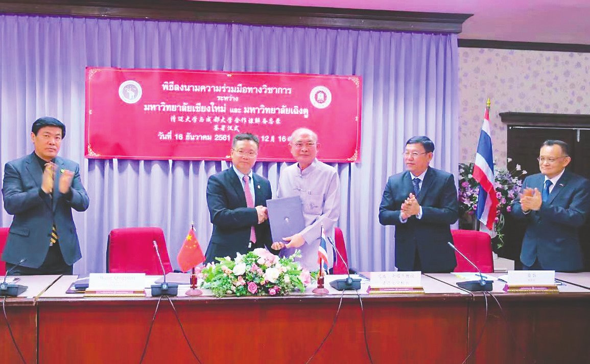 12 月 16 日,在罗强市长、清迈府府尹素帕猜·颜素宛、中国驻清迈总领事馆代总领事潘瑾和泰国驻成都总领事馆总领事吴威徳的见证下,王清远与清迈大学校长尼维·南塔芝续签两校合作谅解备忘录,开启了两校友好合作的第二个十年。我校中国 - 东盟艺术学院影视与动画学院与清迈大学媒体与艺术学院签署硕博联合项目协议,海外教育学院与清迈大学国际数字创新学院签署共建清迈 - 成都“一带一路”友城研究中心合作协议并启动数字创新与金融技术专业本硕博联合培养项目。