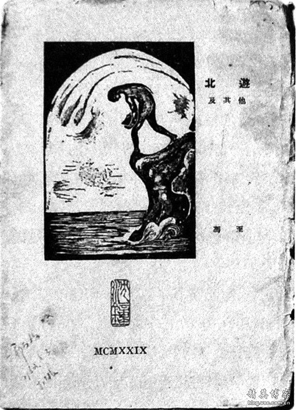 1929年出版的冯至诗集 《北游及其他》,封面为日本画家永濑义郎的木刻版画《沉钟》,其下方的篆刻内容为“沉钟”。