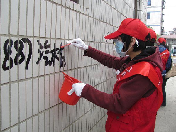 前往清除城市“涂鸦”的主要是来自电子与信息工程系的志愿者们。他们提着红色小水桶,拿着刷子、抹布等,沿着街道将电线杆、公交站、电话亭、路标、垃圾桶等公共设施上张贴的广告清除干净。在他们一个上午的努力下,一张张破坏融城风貌的牛皮癣被刷洗干净。