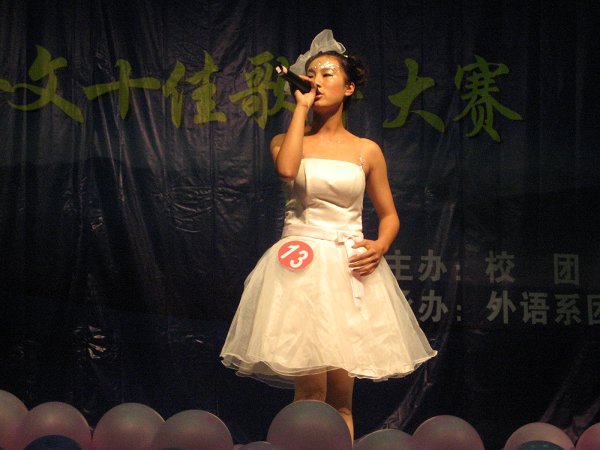 4月25日晚,校第五届外文十佳歌手大赛落幕,体育系周娉婷摘得桂冠。图为周娉婷深情演唱。本报记者 周莉娟 摄