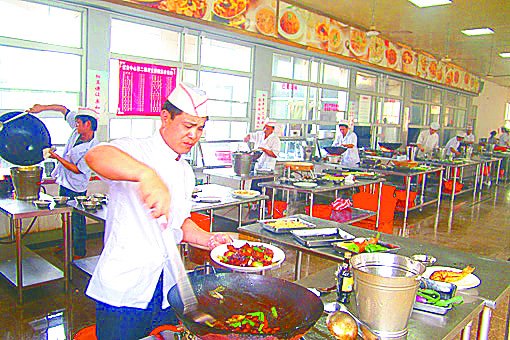 4月30日,校饮食管理服务中心第五届“五一”员工技能比赛举行,曾培腾获烹饪一等奖;杨道玉获打米饭一等奖;朱德英获刀工一等奖;蔡秀芹获速算一等奖;蔡秀华、许丽清、郑美珠和田细萍分获包饺子、包扁食、包春卷和分菜项目一等奖。图为烹饪比赛选手拼厨艺。 本报记者 罗建彬 摄