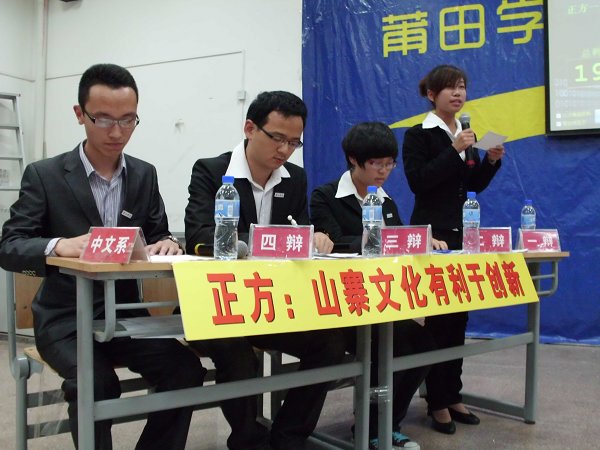 4月28日晚,校第八届辩论赛半决赛燃起战火,外语系、中文系闯入将于5月12日进行的决赛。图为中文系辩手发言。中文系团委 新闻部 常叶勇 摄