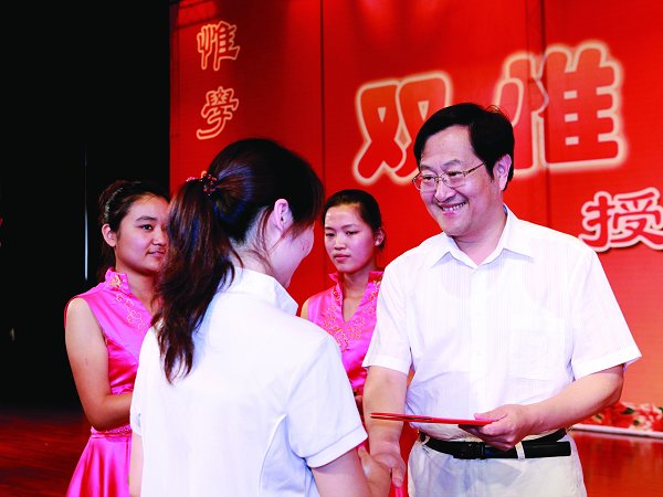 刘红宁的心情依旧十分复杂,他为双惟学子因为坚持和习惯,顺利获得双惟学子证书感到由衷的高兴;又为双惟实践班通过5年的探索和完善,已经走向成熟、喜获丰收而深感欣慰;同时,也为一批因为双惟实践变得更加优秀的同学的毕业离开而不舍。尽管他尽力克制自己,但当伴着长时间的掌声走向讲台,并收到双惟学子送给他礼物的时候,他的眼眶再次湿润了,他与已经坚持了5年双惟生活的06级双惟学子一一拥抱,给他们送去慰问和祝福。