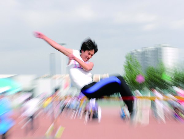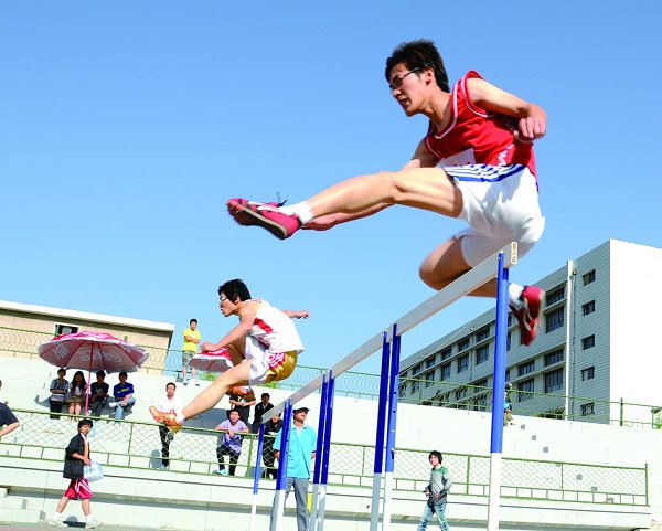 百米跨栏是整场运动会的亮点之一,它的难和险是有目共睹的。发令枪一响,四个跑道的男选手们一口气冲了出去,场外的加油声一浪浪沸腾起来,却见跑在4道的选手在跨越第3栏时,脚下一晃一头撞在要跨越的栏杆上,身体重心一低,整个身子顺势钻过了栏杆。此时,其他选手早跑远,争夺名次已经无望。可是,他依然从地上站起来,重新起跑,完成跨栏,只是坚持一步,他虽败犹荣。 (王佳雯)