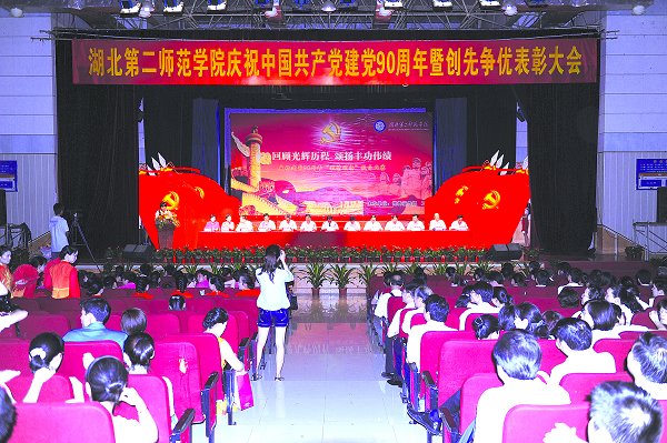 在庄严的国歌声中,湖北第二师范学院庆祝中国共产党建党90周年暨创先争优表彰大会拉开帷幕。由原湖北教育学院党委书记、老党员孙明祯领誓,台上的新党员代表和现场全体党员一起向党旗宣誓。接着,大会对学校优秀基层党组织、优秀共产党员、优秀党务工作者进行了表彰,校长罗五金宣读了省级获奖单位和个人名单,校领导为获奖单位和个人代表颁奖。新党员代表钟铭婷、优秀党员代表尹开宁、优秀党务工作者代表龚义建先后发言。