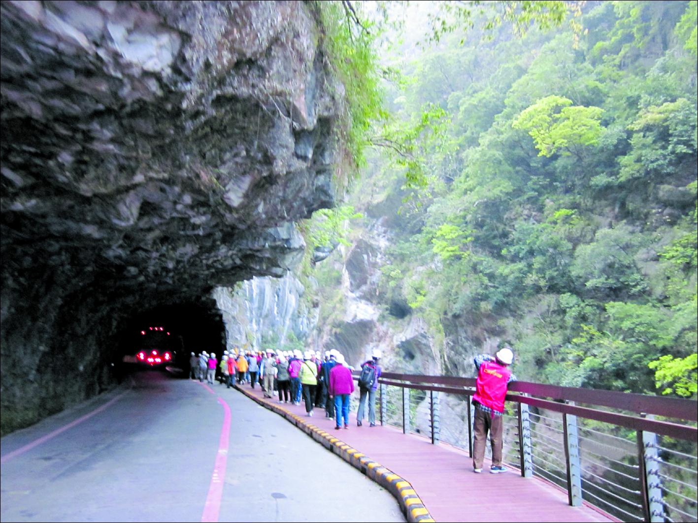 北回归线横穿台湾岛中部,位于嘉义县以南。作为地理标志,在我国共有9座北回归线标碑,在台湾有3座。我们只在台东与花莲交界处看到耸立的北回归线标碑,标碑呈灯塔状,圆柱形的白塔一柱擎天,煞是壮观。白塔中间有一条狭缝,能容纳一人走过,游人在狭缝中走来走去,就意味着在北纬23.5度的标志线上行走。这条线就是热带与亚热带的地理分界线。每年夏至时节,这里会出现立竿不见影的现象。地处花莲的太鲁阁峡谷是由立雾溪千万年冲刷而成,以险象奇绝闻名遐迩。峡谷岩石陡峭,直上云天,与地面成90度直角,奇妙的大理石,惊险的清水断崖让人们赞叹大自然鬼斧神工的魅力。正当我们沿步行道路走在燕子口景点时,山顶上有数块滚石跌落,砸在路面上发出巨响。我们的台湾导游被此景吓坏了,问我们还敢不敢去下一个景点九曲洞,谁料到全组团的伙伴们没有一个被险情吓住,坚持要去九曲洞。