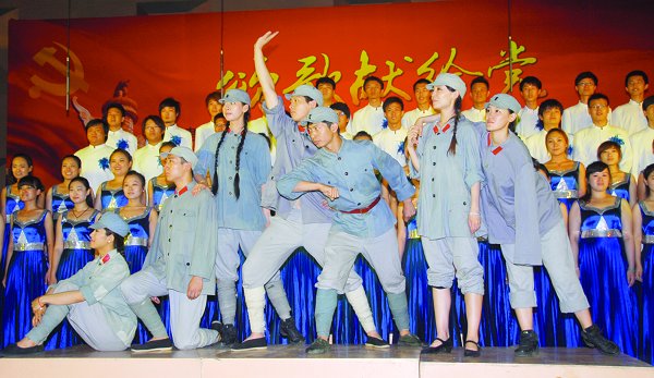 在激情洋溢的主持下,学前教育学院首登舞台,一曲《我象雪花天上来》,优美的歌词、悠远的和声、华美的舞姿,一开场就吸引住了师生们的视听;美术与设计学院的师生们着盛装,以诗朗诵加合唱的方式表达对党的深情;新闻传播学院师生带来的展演节目《颂·歌》,完美融入传统与现代唱法,为党放声歌唱。舞蹈、朗诵、独唱、大合唱,多样的表演形式聚焦了师生们的目光;文学院的历史短剧《天下归心》模仿《非诚勿扰》的节目模式,对社会生活中的工人、农民、商人、军人、学生在中国革命中的力量进行了评定,节目台词设计口语化、大众化,并和我校师生的日常生活相联系,更是引得在场师生连连拍手叫好;音乐与影视学院以华美阵容亮相舞台,原创歌曲《党旗颂》震撼人心、令人感动……各学院比赛节目结束后,校领导与机关青年教师代表为全场师生带来了精彩的展示节目《唱支山歌给党听》和《中国,中国,鲜红的太阳永不落》。本次展演在大合唱《走向复兴》的嘹亮歌声中落下帷幕。