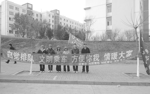 在每个周五、周六、周天的下午5:00至晚9:00时段,在东校区通勤车车站站台候车的学生总能看到佩戴着志愿者袖标的志愿者在候车队伍旁维持秩序,疏导人流。我校通勤车车队司机对此感触颇深,一位司机师傅说:“大冬天的一站就是两三个小时,这些志愿者真是不容易啊。”而自2008年3月维护通勤车站台秩序的志愿服务活动开展以来,志愿者已经坚持了2年零8个月了。