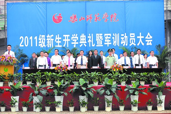 本报讯(记者胡婷、郑艳)9月13日上午9时,2011级新生开学典礼暨军训动员大会在学校田径场举行。校领导谭辉旭、罗大玉、杨胜宽、陈立志、谢相勋、罗国荣、任学锋、张元勤、陈晓春、杜学元,武警乐山某支队副队长黄建明中校以及学校相关职能部门负责人、各二级学院负责人、军训团全体教官、2011级全体学生参加开学典礼暨军训动员大会。大会由党委副书记陈立志主持。