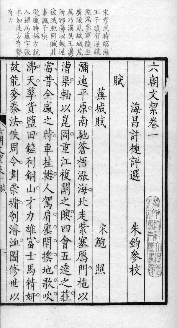 许梿十三岁时就“喜绎徐庾 诸家文”,认为“三唐奥窔,未有 不胎息六朝者”,于是自嘉庆十一 年(1806)开始辑选,“易稿者数 四”,历时二十年,始刻印面世。
