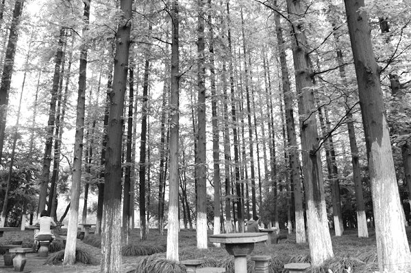 我校中山北路校区,水杉很多。办公 楼侧,老图书馆旁,友谊路边,老干部办公 楼前,都有上摩浮云的林带;一村楼前楼 后,也是冲天屹立的纵队,给美丽校园增 添了一处处壮丽景观。把水杉选定为校 树,非常恰当,寓意深远。