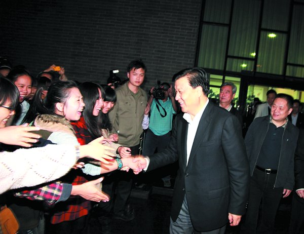 视察结束后,刘云山部长微笑着与一直等候在门口的学子们握手道别。