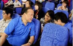 我院党委书记于晓光(前排中)与成都体院院长陈伟(前排右)、党委副书记李国栋(前排左)一起观看新闻艺术节开幕式。