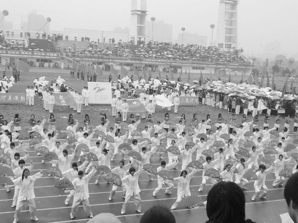 此次校运会的开幕式在雨中进行,各个学院的方阵队冒雨进行表演。秋雨的寒冷浇不灭他们心中的热情,一张张青春洋溢的笑脸是雨中最美的彩虹。各个学院的方阵队都别出心裁,创意无穷,这其中也着实花费了一番工夫。记者印象较深刻的是文史学院的方阵队,72名女生身着一袭白衣舞动着火红的太极扇,轻灵的跃动仿佛是雨中盛开的一朵朵白色莲花,而在《中国功夫》的背景音乐下,这群“白色莲花”却又显得那样铿锵有力。“身着轻薄表演服,站在细雨中,的确是很冷。”文史学院方阵队队员董同学说道,“但一回想到排练时期每天的早起和课余时间的牺牲,就会告诫自己:不能让辛苦白费。”正是抱着这样的信念,队员们不断鼓励自我,鼓励他人,最终赢来观众赞许的掌声年轻的他们用自己的方式书写灿烂的青春,用自信挥洒豪情,用勇敢对抗困难。而方阵队员们在雨中的的成功演出在感动每一名观众的同时,也似乎预示着这次的比赛会如雨后彩虹一般绚丽夺目。