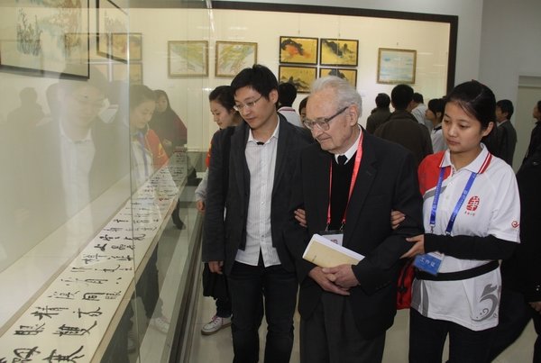 由泉州市政府、香港大学、华侨大学和中国闽台缘博物馆联合主办的 “通会境界———饶宗颐教授二十一世纪书画新路向展”,11日起在中国闽台缘博物馆开展。展览将持续至2012年2月11日,展出了饶公21世纪以来的著作100余本及书画作品60件,全面展示了饶公的艺术风格与学术水平。图为法国巴黎高等学院汪德迈教授观看书画展。(张为健/摄)