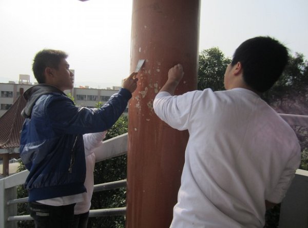 “让我们为学校梳洗吧!”(“让我们为学校梳洗吧!”为保护校园的整齐,让同学们拥有干净的读书环境,同时通过实地实践清理涂鸦来提高同学们的环保意识,让更多的人参与到环保这支大队伍中来,12月4日上午,我校青年志愿者于教学楼、食堂片区、连廊等地开展了校园涂鸦清理活动。