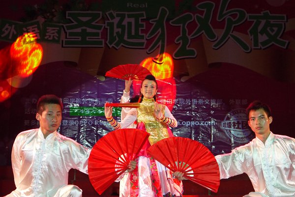 12月21日晚,外语系圣诞狂欢晚会在文荣体育馆精彩上演。外语系十佳歌手王硕演唱《十佳风采》,日语班和骑士团带来《神秘的日本文化》,艺术系田汶弘凭借清亮的嗓音和动人的舞姿演绎了梵文歌曲《万物生》,外教Sam和Grace带来一首外国嘻哈歌曲《Don’t waste your life》,晚会在11级商务闽台班一曲悦耳的《圣诞铃音》中落下帷幕。前来观看晚会的校团委书记林萍兰说:“同学们多才多艺,充分展示了专业特色,整场晚会很流畅,圣诞气氛浓厚。”外教Venky则兴奋地说:“This is a perfect show,I enjoy myself very much.”