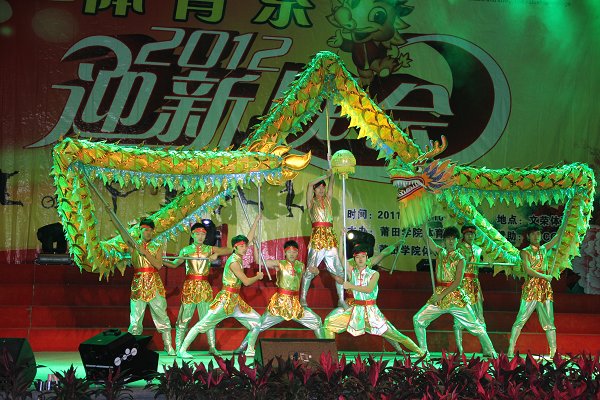 12月16日晚,文荣体育馆歌舞升平,欢笑不断,体育系2012迎新年晚会在这里激情上演。只见一条金龙从侧馆跃出,绕着观众席游走,独特的开场方式令观众激动不已,掌声、欢呼声此起彼伏,掀起晚会的第一次高潮。晚会节目精彩纷呈,有激情四溢的舞蹈,有婉转动听的歌曲,有诙谐幽默的小品,还有端庄高雅的戏曲。值得一提的是,几位到场观看晚会的领导和教师也上台参加游戏,在默契的配合下,将“孙悟空三打白骨精”完美地演绎了出来,赢得现场一阵阵热烈的掌声。