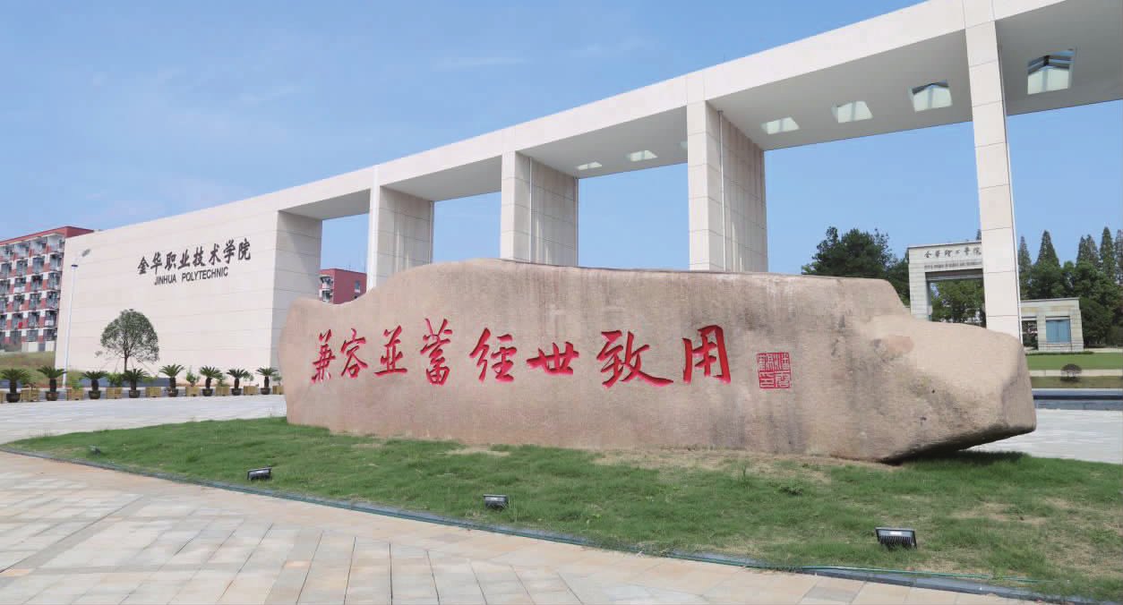 石碑位于南大门中心广场,南临湖海塘,石碑长14米、厚1.2米、高2.6米,重约87吨,材质为鹅卵石。由潘云鹤院士题写的“兼容并蓄 经世致用”学校精神雕刻其上,此石碑由华孚色纺股份有限公司董事长、我校82届校友孙伟挺出资捐赠。“兼容并蓄”出自明代方孝孺的 《复郑好义书》,是指把不同内容、不同性质的东西收集保存起来。这个词准确生动反映了多校合并的历史、高职教育跨界的特性以及建设世界一流高职的发展要求。“经世致用”学说最早由南宋著名理学家、浙东婺州学派代表人吕祖谦提出,要求学习、征引古人的文章和行事,应以治事、救世为急务,反对不切实际的空虚之学,生动体现了金职人秉持地方风骨,关注社会现实,愿用所学解决社会问题,实现社会价值的目标。