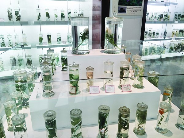大厅旁一个略带几分欧式风格的长梯,是参观者通向二楼的唯一通道,爬上楼梯,几扇似古建筑的红色大门映入眼帘,和天花板上悬挂的圆柱形古风吊灯和谐相映。顺着楼梯口的朝向,我们进入了第一个展馆,里面陈列了各地近上百种的道地药材,展馆内部还分有濒危物种、动物药、矿物药等不同展区,让参观者看的目不暇接。紧挨着它的是科技教育馆,该馆汇集了中医药的防病治病、保健养生中医药鉴定等相关科普资料,在这里我们参观到了人参、鹿茸、冬虫夏草、天山雪莲等系列珍贵药材实物标本。馆内设计的药材鉴定,将图片实物与科技相结合,让每一位体验者都赞不绝口。随后我们又来到浸制保鲜标本馆,一株株新鲜嫩绿的植株吸引了大批前来观看的同学,从解说员那里得知,这些都是采自大自然的新鲜植物标本,通过特殊防腐保鲜处理,装于盛有保鲜液的容器中,使其色泽长期保存,并保持原有形态。看完后,同学们纷纷感叹道:这不就是中医大的“室内药植园”吗?最后,我们来到了濒临生物及其他馆,在靠近馆口处备有一台浏览装置,可供参观者查看当今世界各种濒危物种,而不仅仅局限于学校博物馆现存的。在设备旁有三个长型玻璃柜并列排放,里面盛放的是国家一级保护野生动物的骨架结构,在这块区域会有一些淡淡的福尔马林的气味,是从保存有大黄鱼的容器里散发出来的,容器里的两条大黄鱼是我校1983年购于青岛海洋博物馆,虽然时隔久远,但至今仍保存完好。向馆内部延伸,能看见一群野猴正在一棵花繁叶茂、枝干高大的珙桐树上嬉戏打闹的场景。当今先进的全息投影技术、影视听结合技术,能让每一位驻足者都身临其境,感叹即使身处繁华都市,也能惬意体会大自然的美妙神奇。