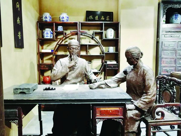 展馆另一侧布置的是清代药房,用实物再现古时药房风貌。这是一套从民间收集的完整清代药房,药房门上一块匾额,上书“步景堂”三个大字,齐腰高的药台上摆放着算盘、药兽和砚台,从讲解员那里得知,这三样东西被古人称为药房柜台的“药房三宝”,尤其是其中的药兽,只有药台上摆了药兽,才代表这里的药材货真价实。药台后面是一整套陈旧却干净的清代药柜,里面曾经盛放着许多名贵药材,从一旁经过,似乎还能闻到药柜里散发出的淡淡的中药香气。药柜旁还倚着一排长椅,长椅上有小型方桌将椅子隔成小座,旧时人们看病等候之时就坐在此地喝茶聊天。说到药房就不得不提“葫芦里卖的什么药”这句俗语,虽然现在这句话被当做调侃使用,但是成中医的这个“清代木质伤药葫芦”却可以给它正名。这葫芦做工精致,黑里洒金,外侧刻有精细的文字,一看就不是俗物,据说它出土的时候壶里还检出了药粉,看来这葫芦里卖的的确是好药!