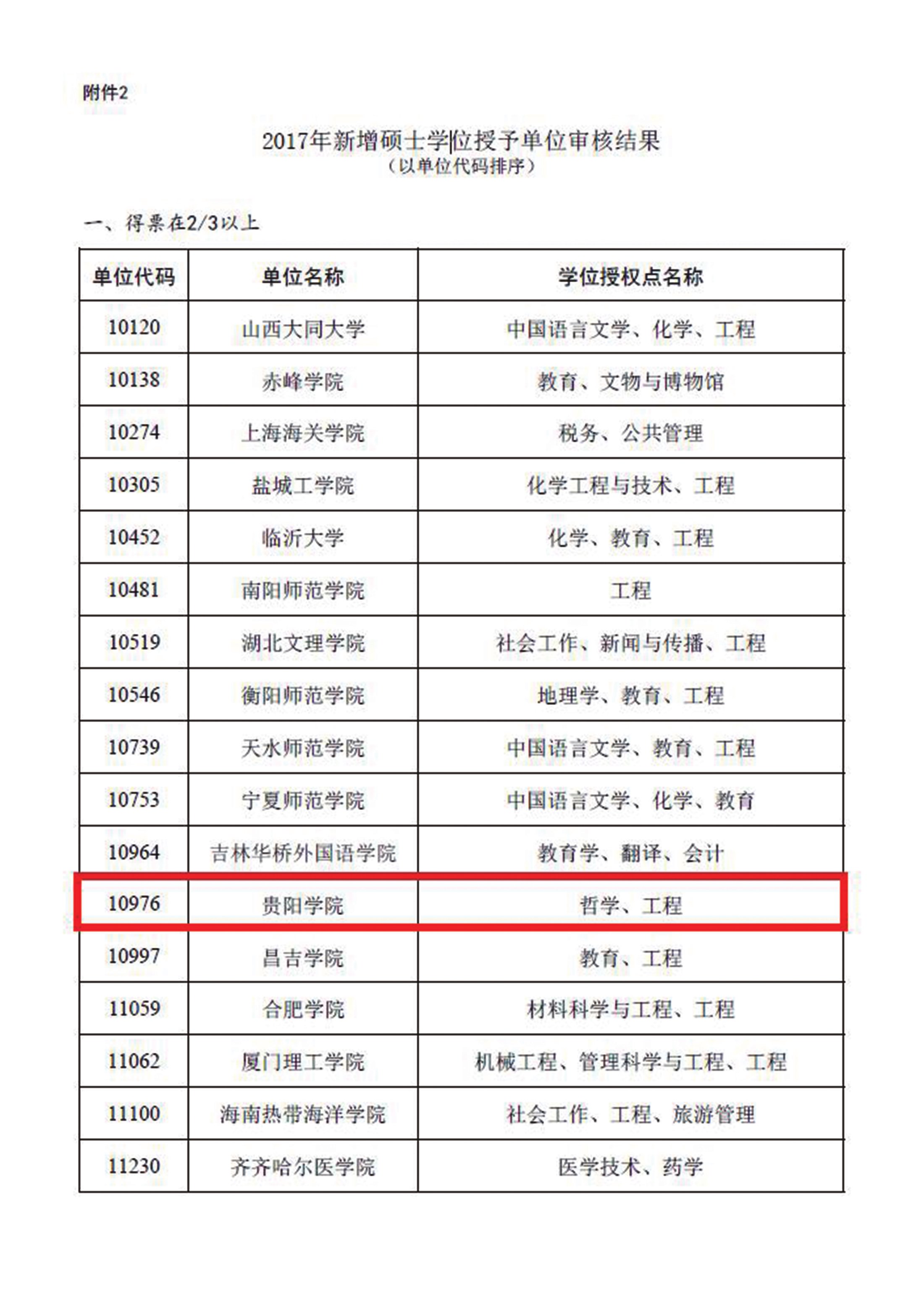 - 第1期 我院通过国务院学位委员会会议表决增列为硕士学位授予单位 汤 华 2018-03-14T16:00:00.000Z 61 本报讯 经公示无异议、零投诉,贵阳学院硕士学位授予单位于 1 月 30 日正式通过国务院学位委员会表决。国务院学位委员会办公室公示了“2017 年学位授权审核结果公示”,贵阳学院为贵州省 2017 年唯一一所新增硕士学位授予单位,新增两个学位授权点:哲学、工程。