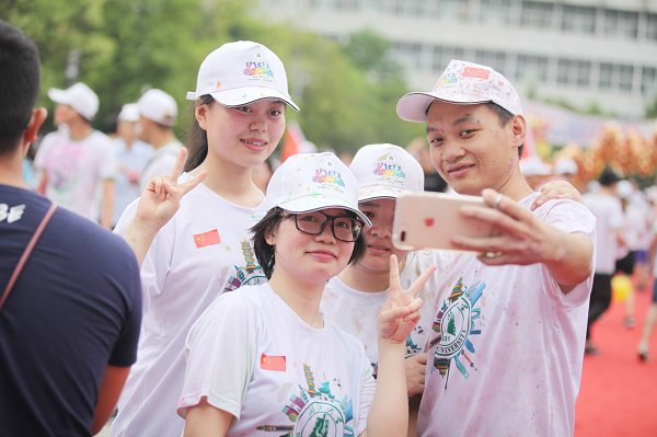 在求索广场的终点站,经济学专业2018届毕业生喻志乾和女友携手跑完了全程,相识10多年,两人毕业都留汉参加工作。“牵着她的手一路跑下来,缤纷的彩虹粉,噼里啪啦气球爆炸声,觉得这辈子要牵手的人就是她了,仿佛这一路就是一生。”虽然气喘吁吁,汗水浸湿了衣衫,但笑容依然挂在他们的脸上。