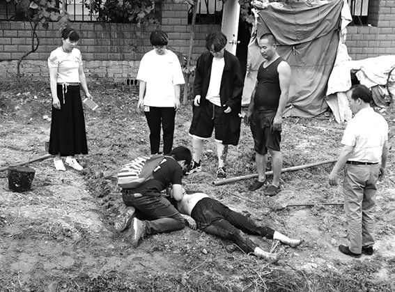 从旁边群众的议论中,廖圳龙和同学们知道了一个大概———太婆在自己居住小区旁的菜地里劳作,在从菜地旁的水沟打水时,不慎跌了进去,一个解放军战士和旁边群众闻讯赶来救起,并且拨打了120。