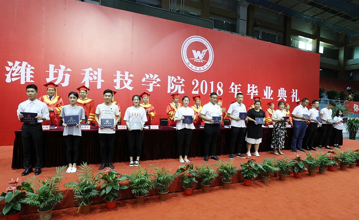 副校长李广伟宣读《潍坊科技学院关于表彰2018届优秀毕业生的决定》《潍坊科技学院关于表彰2018届优秀毕业设计(论文)的决定》《潍坊科技学院关于为2018届合格毕业生颁发毕业证书的决定》。主席台就座的校级领导为优秀毕业生颁发荣誉证书,并为本专科毕业生颁发毕业证书。