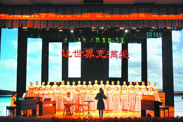校艺术团的同学也为艺术节献上了一场场精彩的演出。管弦乐露天音乐会那天,天空飘起了雨,但却没有阻挡同学们的热情。济民广场上音乐声和着雨声,演员们专注而认真的表情与灰蒙蒙的天空形成鲜明对比,观看演出的同学们中不时爆发出一阵阵热烈的掌声。“让世界充满爱”合唱音乐会和“平凡中的奇迹”舞蹈演出也展现了西财人多才多艺的一面,给本次艺术节带来一股清新的气息。