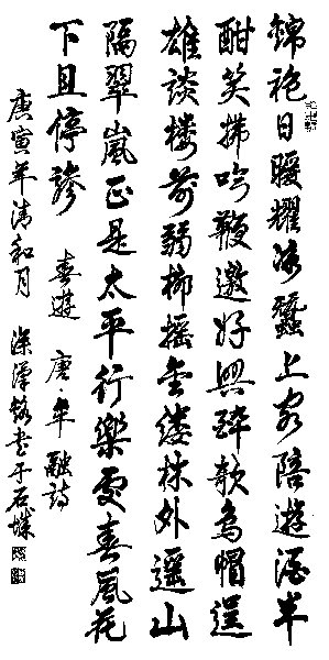- 第17期 书画赏析 2010-06-19T16:00:00.000Z 247 春风拂送人境暖,五月金陵花艳阳。最数校园桃李美,老丁笑看新秀强。锦袍日暖耀冰蚕,上客陪游酒半酣。笑拂吟鞭邀好兴,醉欹乌帽逞雄谈。楼前弱柳摇金缕,林外遥山隔翠岚。正是太平行乐处,春风花下且停骖。———[唐]牟融《春游》