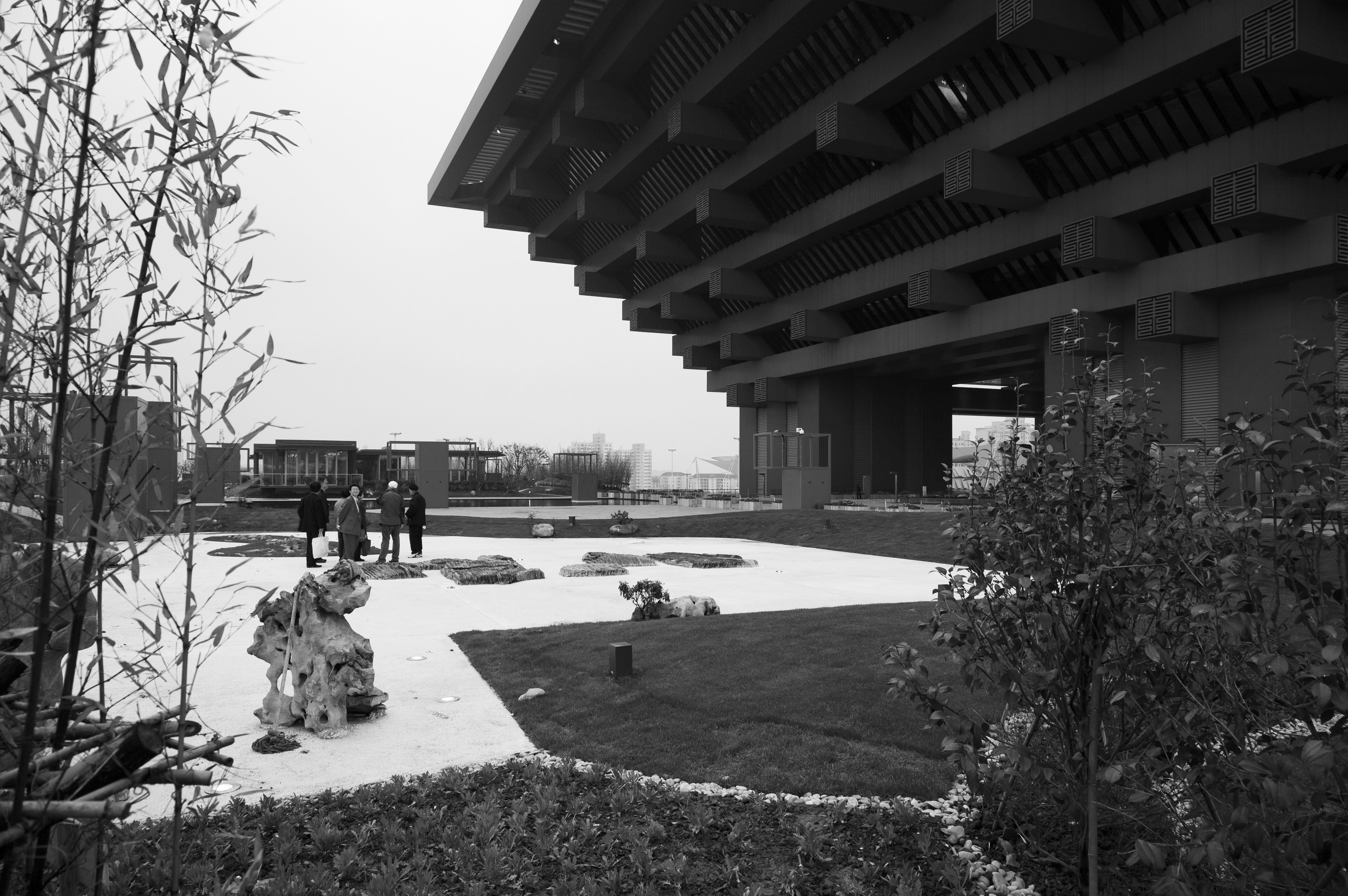 “作为中国馆景观重要组成部分的 ‘新九洲清晏’,也是将中国传统的山水画立体化,通过写意手法表现世界与自然”,张利介绍说。面积约2.7万平方米的“新九洲清晏”,高出地面14米,称得上是用东方园林传统建造的现代都市中的空中花园。在土地资源日益紧张、人口密度越来越高的当代都市,“新九洲清晏”开辟了人与自然亲密融合的新空间。