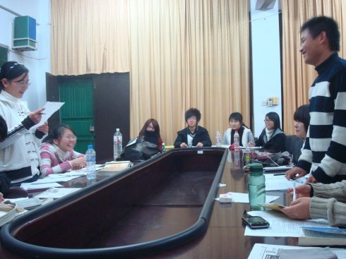 图为 09年 1月16日,Vento组织队员观看全国大专英文辩论赛视频,学习正规的辩论语言和技巧。