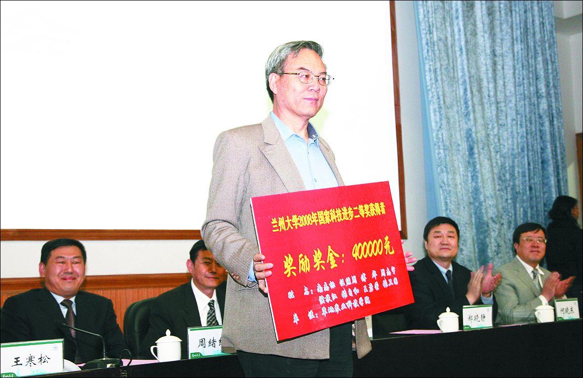 会上,副校长陈发虎宣读了《关于2008年度科研工作奖励的决定》。决定指出,为了不断提高我校的科研整体竞争力,鼓励我校教职员工从事科学研究的积极性,使我校获得更多重大项目的支持、产出更多高水平的成果,学校对在2008年科研获奖、学术论文(著作)和专利(标准)、重大项目、经费贡献和科研组织等方面表现突出的个人和单位进行奖励,奖励总金额为507.9万元,创历史新高。2008年我校科研工作取得了一系列重要成果和突破,科研总经费达到历史最高水平,共获得国家科技奖励4项、高等学校科技进步一等奖1项、甘肃省自然科学一等奖1项、二等奖3项、甘肃省科技进步二等奖2项、中国青年科技奖1项等,发表SCI一区论文24篇,为提高学校核心竞争力作出了重要贡献。