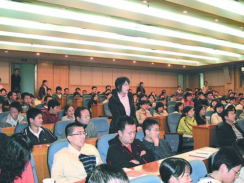 9月初开课,受追捧程度让人始料未及。招商银行零售银行刘建军总经理首讲的“零售银行业务最新发展”,原本定在研究生楼501教室,被挤个爆满,很多学生不得不挤在教室后面,踮起脚尖伸长脖子听课,后来教室很快改到能容纳200多人的光华楼东厅。之后,一系列高水平的授课吸引了许多其他专业的研究生前来旁听,甚至柳林校区的本科生也赶到光华校区听课,200多人的学术报告厅常常座无虚席。