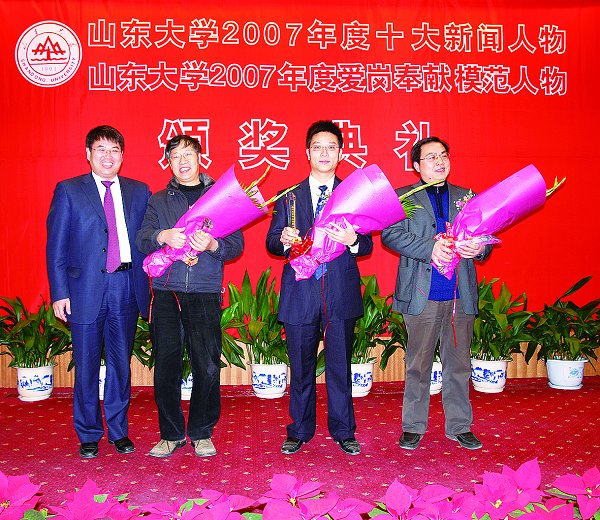 展涛说,我们山大是一个丰富多彩的大家庭,是一个由众多的老师、学生以及管理人员和服务人员共同组成的大家庭。今天获奖的2007年度十大新闻人物和2007年度爱岗奉献模范人物展现的是整个学校的风采,他们代表了整个山东大学的精神面貌,体现了整个学校的水平,他们获得的成绩,是我们学校2007年所取得的进步的重要标志,我们感到非常自豪。