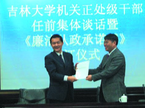 本报讯 (记者 晓晨)12月2日,经申报、考评、考察等严格组织程序选拔产生的校部机关职能部门、派出机构和部分直属单位的正处级干部正式上岗。当天上午,在东荣大厦会议中心第一会议室,我校举行了正处级干部任前集体谈话暨 《党风廉政建设承诺书》签字仪式。校党委常委、组织部部长杨玉新宣读了正处级干部换届任职决定,校党委书记陈德文、校长展涛分别与党、政处级干部签署了 《吉林大学党风廉政建设责任书》。校党委常务副书记兼副校长王胜今主持了仪式。