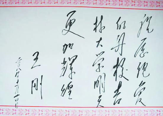 9时35分,作为哲学系1962级系友的王刚回到了他阔别已久的哲学社会学院。他高兴地接过系友献上的鲜花,听取了院长孙利天对学院相关情况的介绍,见到曾经给自己授课的车文博、李鹤、邹钧等老教师格外高兴,与他们亲切攀谈……在随后的座谈会上,王刚回忆起在吉大6年学习和生活的美好时光,感谢母校和老师对自己的培育之恩,对当年的老同学表示深深地怀念,对今年9月因出访国外而没能回校参加哲学系50周年系庆感到遗憾。王刚在谈到吉林省的发展时说,吉林省委、省政府领导班子团结和谐,坚决执行党中央、国务院的正确决策,带领全省人民取得了辉煌成就,吉林大学要全力支持吉林省委、省政府的工作,自己作为一名吉林老乡,一定会为家乡的建设提供支持。展涛代表学校感谢王刚对母校的深切关怀和吉林省委、省政府对学校工作的大力支持,表示吉林大学在搞好自身建设的同时,必将继续为吉林省的建设事业贡献力量、为国家战略发展尽责。王刚最后对母校学子和当代大学生寄予了殷切希望。他说,作为新一代的有志青年要有远大理想、坚定信念,坚持走社会主义道路;要具备真才实学,服务国家与社会;要脚踏实地、不好高骛远;要发扬艰苦奋斗精神,做好社会主义接班人。座谈结束后,王刚高兴地接受了带有车文博、李鹤、邹钧三位老教师签名的哲学系纪念册。