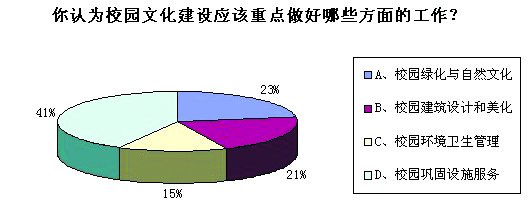 【调查结果】:调查中,45%的同学认为学风建设与科研成果是一个学校文化建设最重要的方面;31%的学生认为美化校园、完善科研设备的校园文化建设的关键;15%的学生认为校园文化建设的重点是举办各种类型的活动和竞赛。