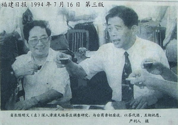 图1、李总裁与陈明义在台北衡阳路天仁文化店内总裁办公室合影;图2、当年李总裁与陈明义以茶代酒相互祝愿的图片(刊于福建日报1994年7月16日第三版);图3、当年陈明义省长栽种的茶树长得很茂盛。