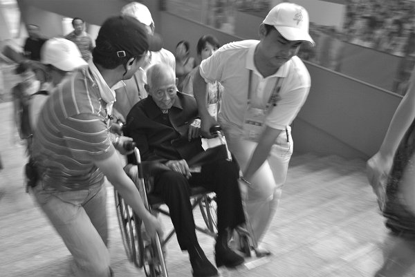 张步升和其他几名志愿者与父子俩沟通后,硬是把老人抬到了楼梯口,并留下一名志愿者照看老人。预演结束后,人流较多,志愿者经过半个小时努力,又把老人抬出场馆。