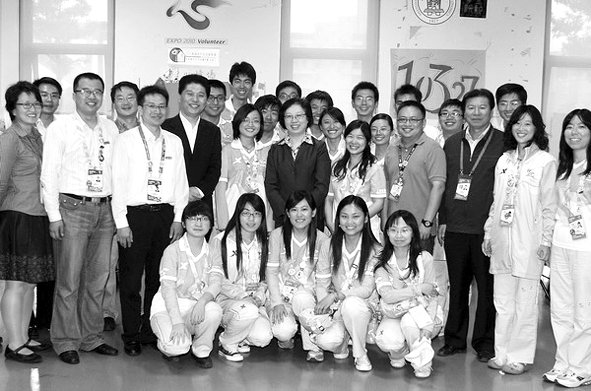 杨学渊代表医学院全体志愿者,把医学院志愿者吉祥物“小依”的特色徽章别于韩市长的西服领口;张博文、欧阳宁娟等也分别将医学院特色志愿者徽章“杏林白菜”赠送给韩市长。韩市长对这些精美别致的徽章表示出浓厚的兴趣,询问“徽章都是你们自己设计的吗?”在得到了肯定的答复后,他风趣地说道:“那我下次来世博会的时候,也要带几个徽章。”“那我们就可以换章了!”张博文一语,引得大家会心一笑,也给忙碌紧张的志愿者服务带来一丝轻松的氛围。