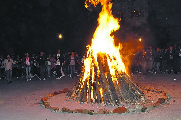 红红的火焰在武珈山篮球场的空地上熊熊燃烧,映红了一张张笑颜,层层的人群围绕着高高的篝火,高声歌唱、欢快舞蹈,互相传递着节日的喜庆。晚上8点,彝族年的压轴节目———篝火晚会在这里上演。