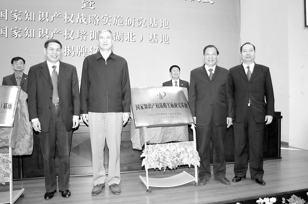 本报讯(通讯员 杨涛 记者 周苏展)11月9日上午,国家知识产权局局长田力普、湖北省人大常委会副主任刘友凡一起为国家知识产权局在我校新设立的国家知识产权战略实施研究基地、国家知识产权培训(湖北)基地揭牌。国家知识产权局人事司司长徐治江、国家知识产权局保护协调司司长黄庆,湖北省知识产权局局长王东风,我校党委书记徐敦楷,校长、知识产权研究中心主任吴汉东以及国家知识产权局、湖北省高级人民法院、湖北省知识产权局、湖北省版权局、湖北省工商行政管理局有关部门负责人等和参加全国高校知识产权师资培训开班典礼的一百多名学员共同见证了这一时刻。田力普局长在揭牌仪式上致辞,希望中南财经政法大学知识产权研究中心通过整合全国知识产权战略研究和人才培养的优势资源,开展国家层面的知识产权战略研究,加强对国际知识产权发展动态研究,确立服务发展、人才优先、以用为本、创新机制的知识产权人才培养模式,为我国知识产权战略实施工作提供有效的决策支撑和坚实的人才资源基础。